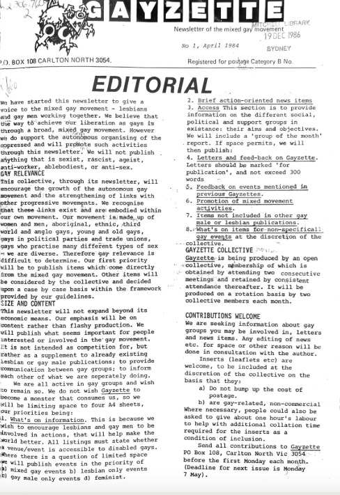 - Newsletter: Gayzette: Newsletter of The Mixed Gay Movement